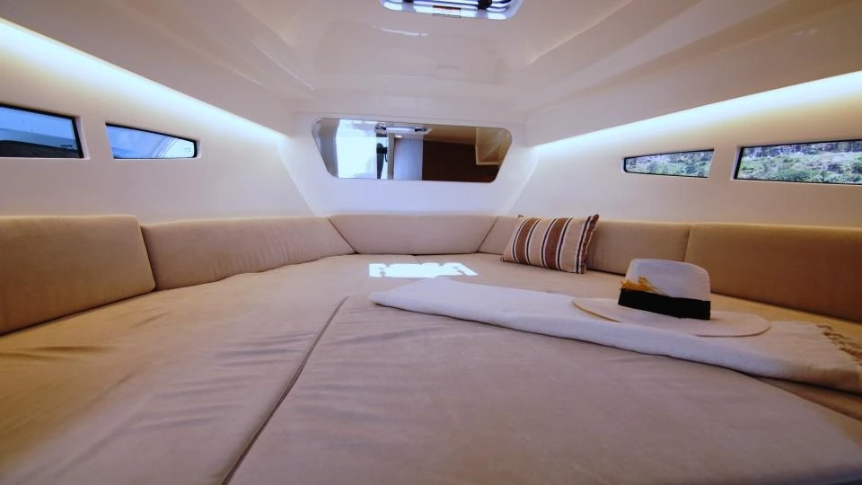 The exterior design focuses on modularity and functionality: at the stern there is a longitudinally sliding seat that can be converted into a sun deck, while the cockpit is designed for maximum utility with wide side aisles, stainless steel railings and integrated bathing platforms. At the bow, the large sun deck with reclining backrests allows you to enjoy the sun in comfort.